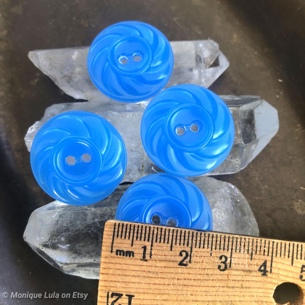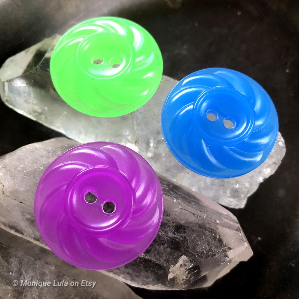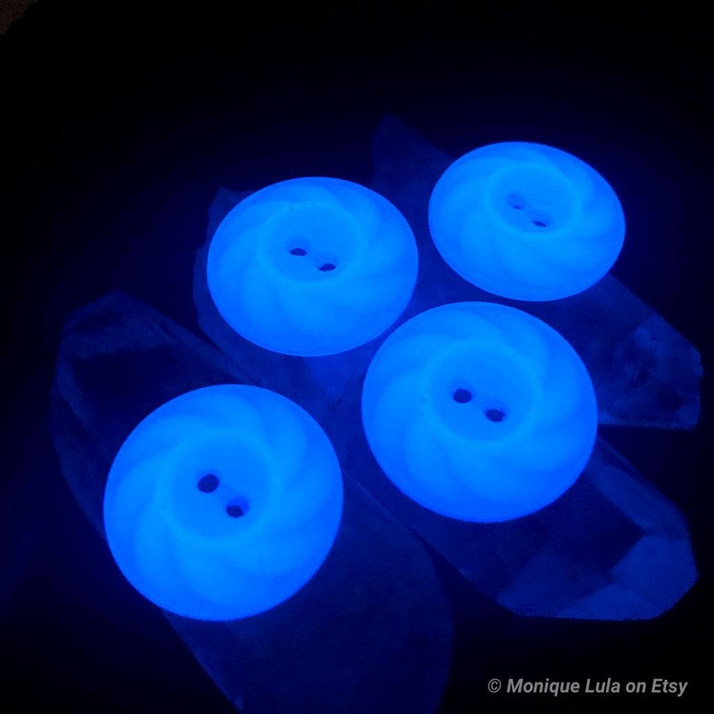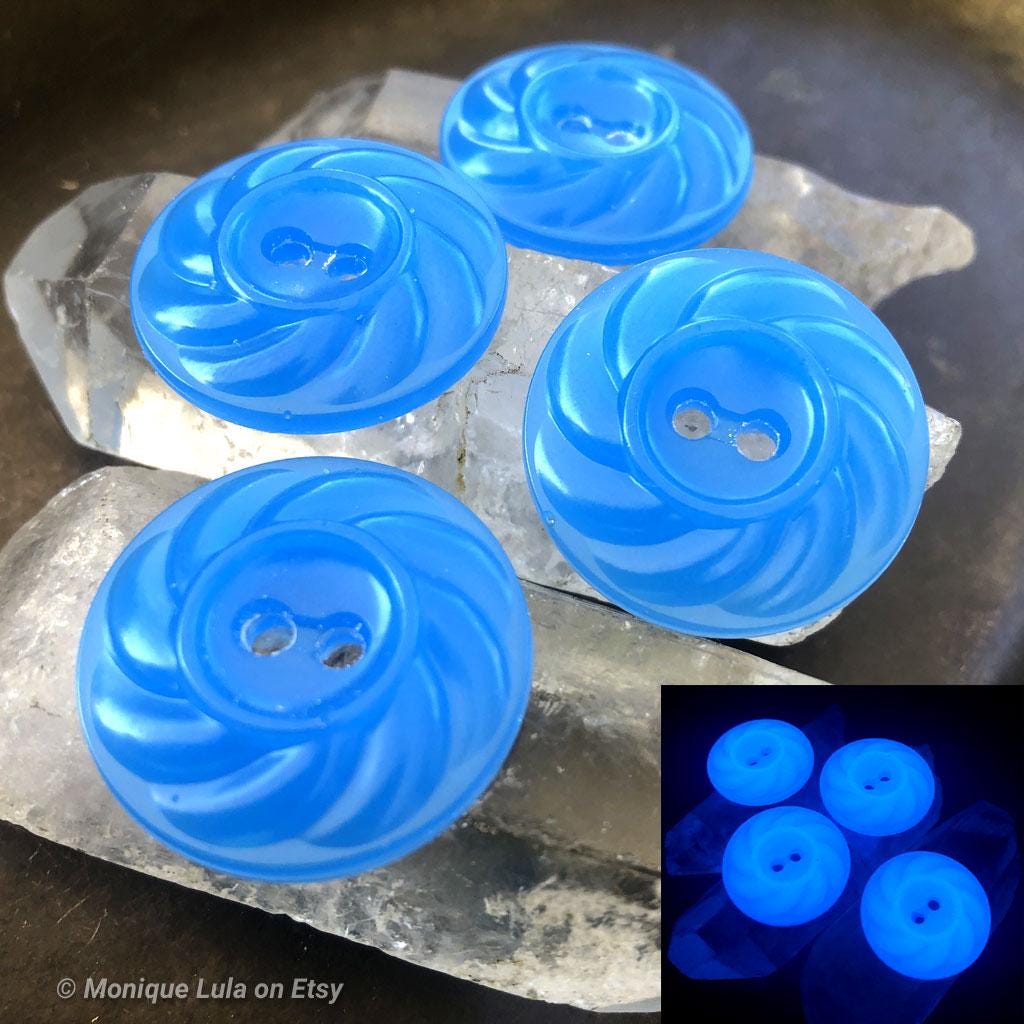 Glow in the dark vintage recreation of pinwheel style buttons. Shown in blue glow in the dark. These are handmade remakes of vintage style buttons.