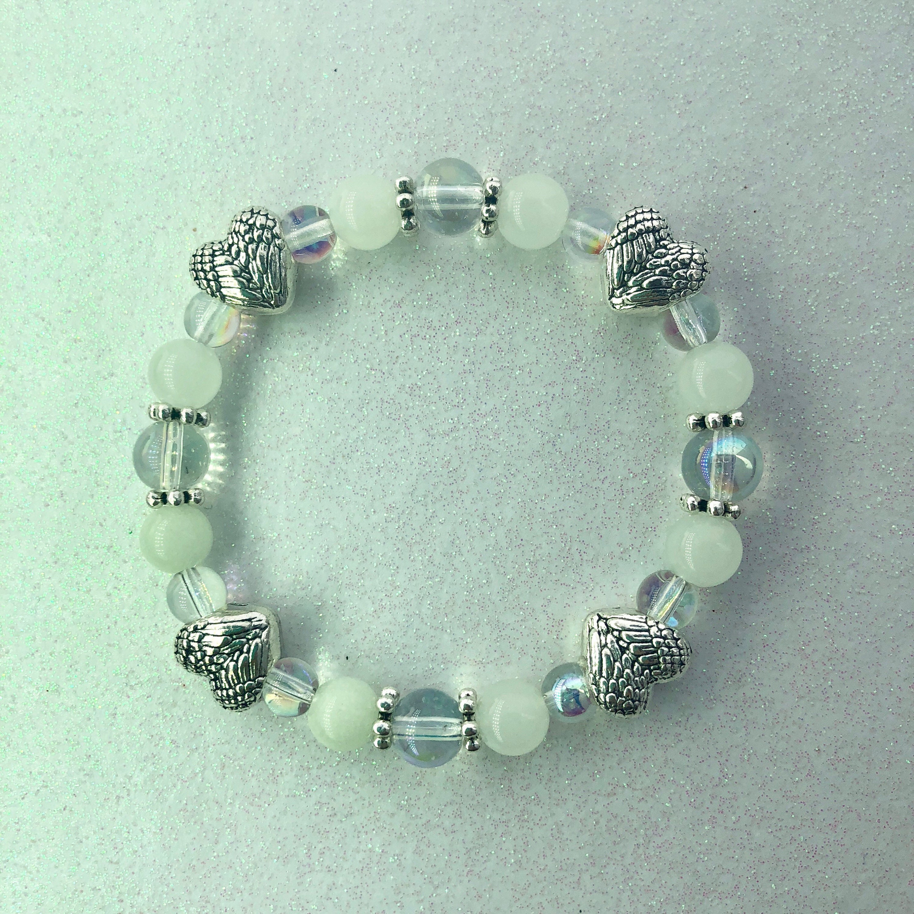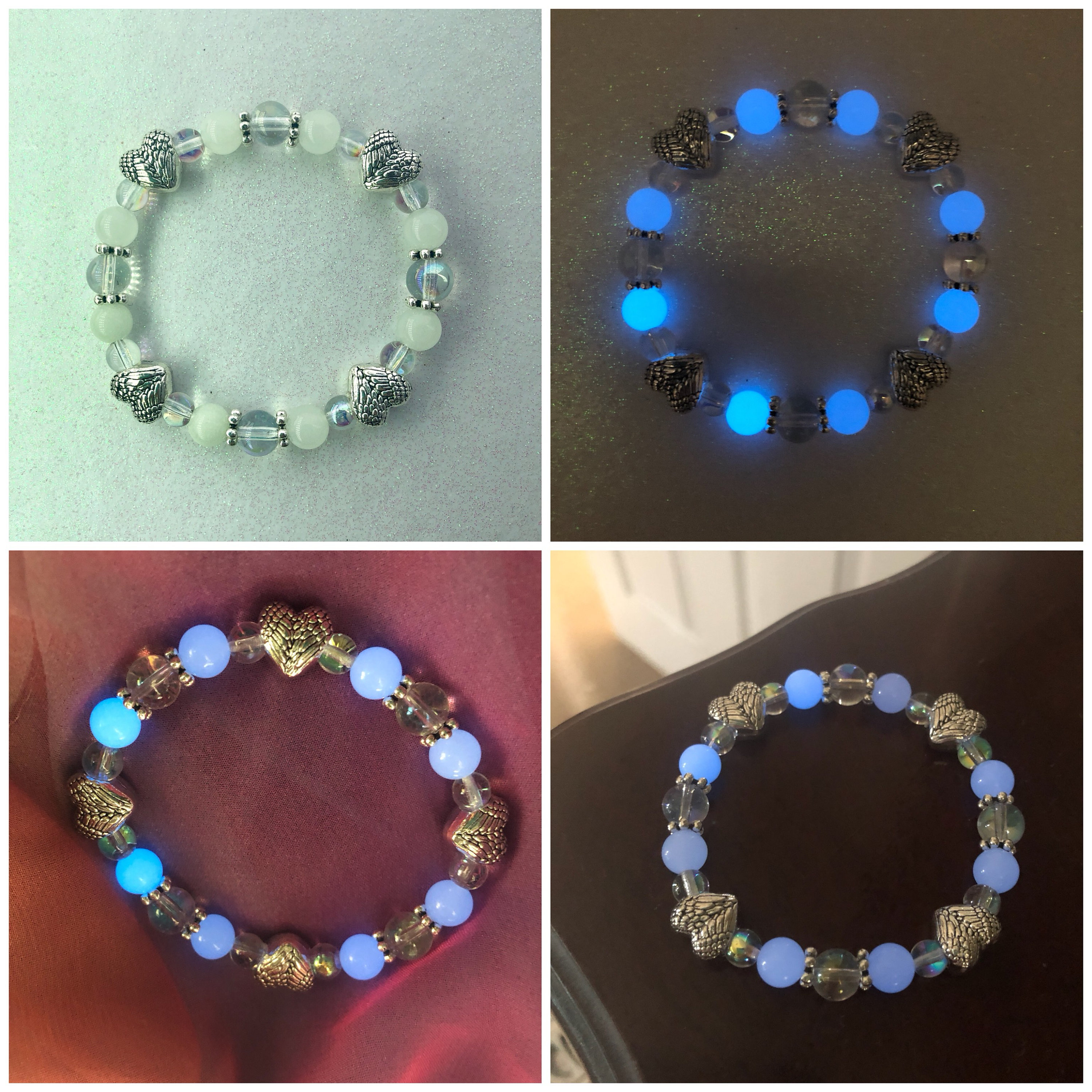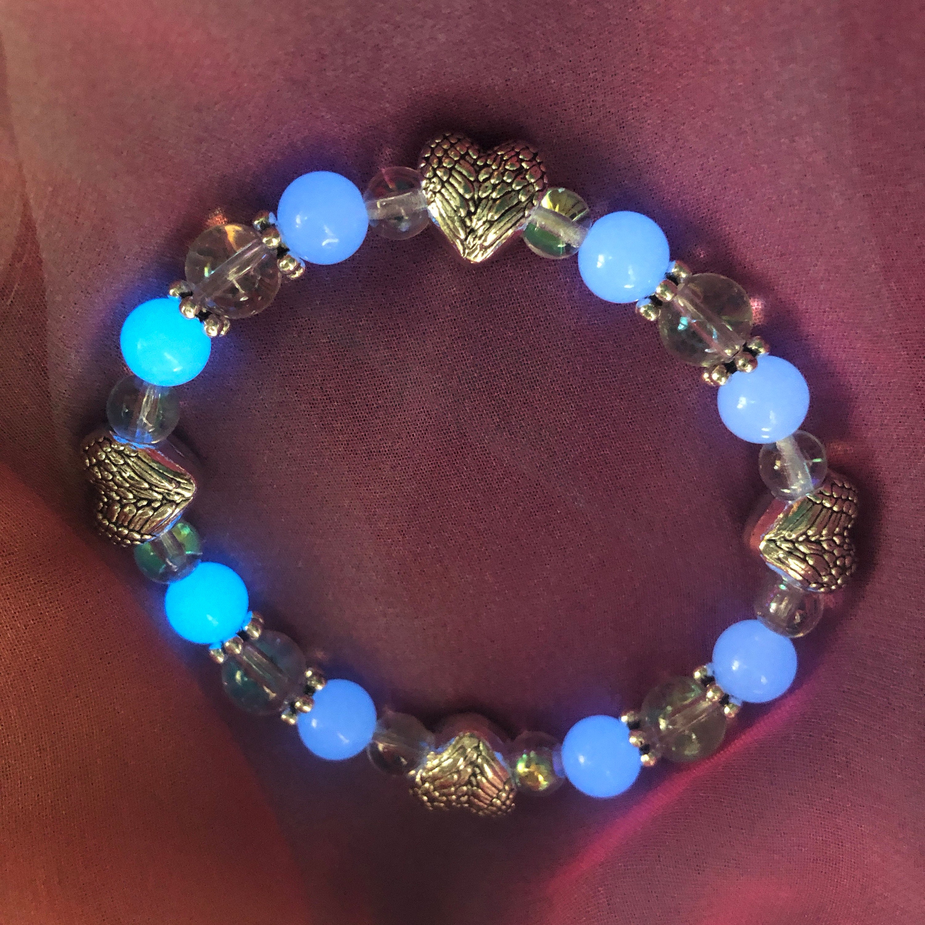 My dear friend lost her beautiful Mother and I designed this bracelet for her. It was made with a heavy heart, but it came out absolutely beautiful. The angel wings are in a shape of a heart, which is so lovely and passionate. I used rainbow coated clear glass beads for a little bit of magic and to represent the beautiful afterlife. We will all meet again in the rainbows. The neutral colored beads glow a beautiful serene blue color in the dark. Just wear in the sun, and the uv lights will charge the glow. All non toxic and will recharge for many years. I use top quality stretch cord and special knots plus glue to make this a comfortable and easy wearing bracelet. When you see the glow on your wrist, it is so magical.<3