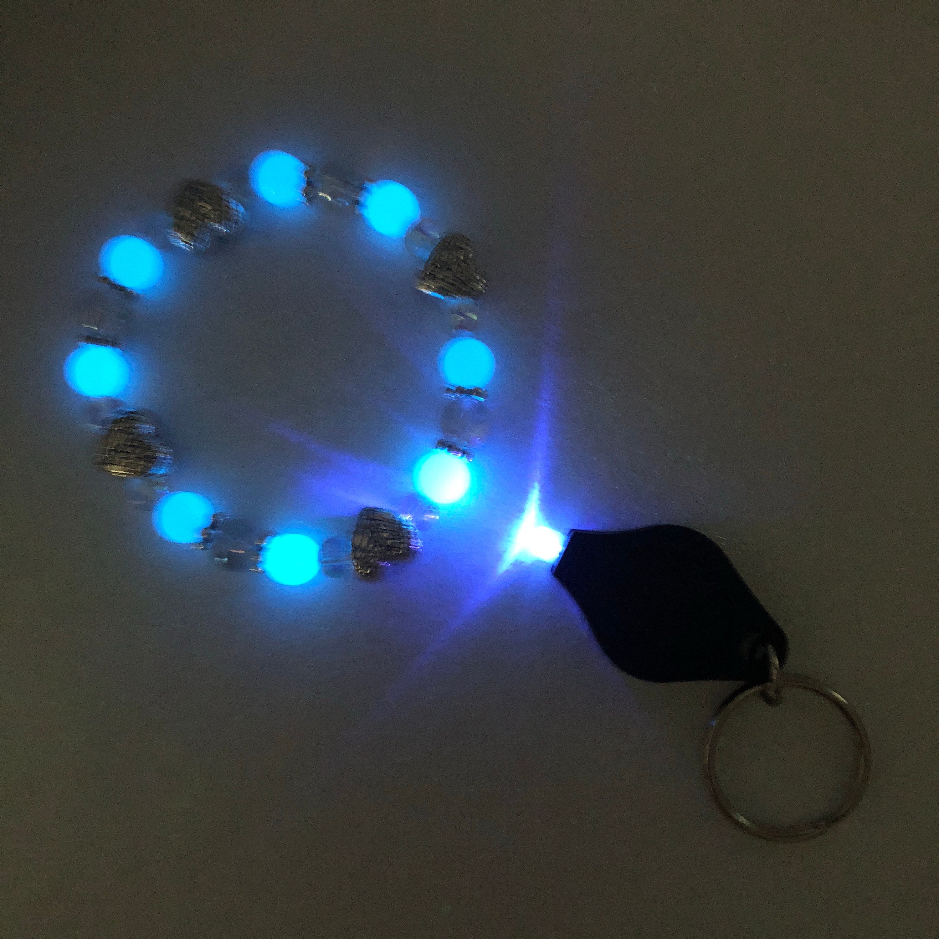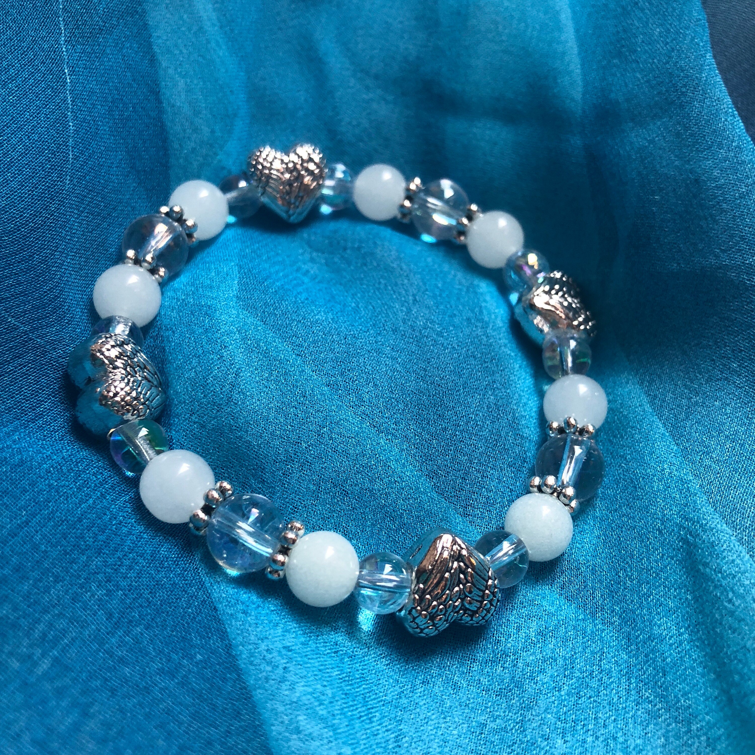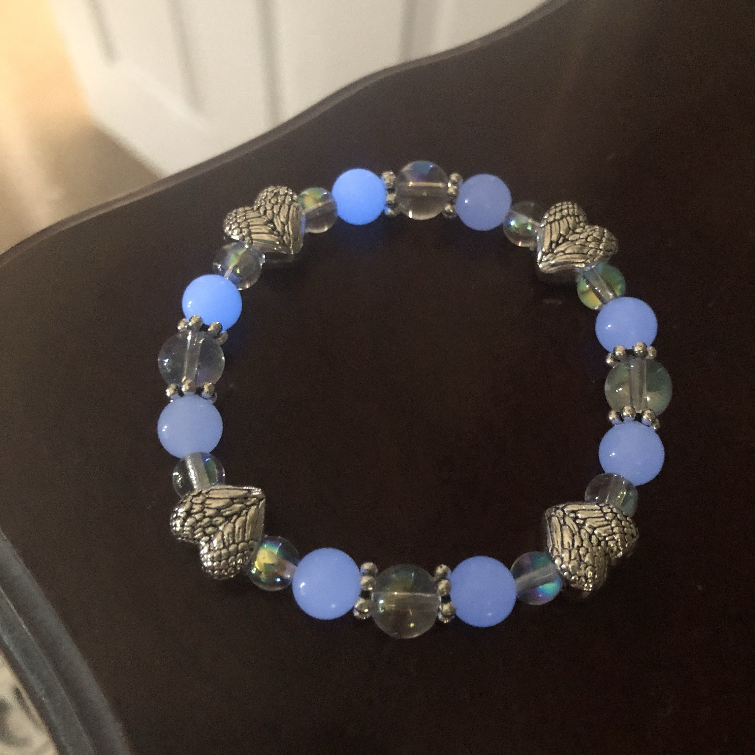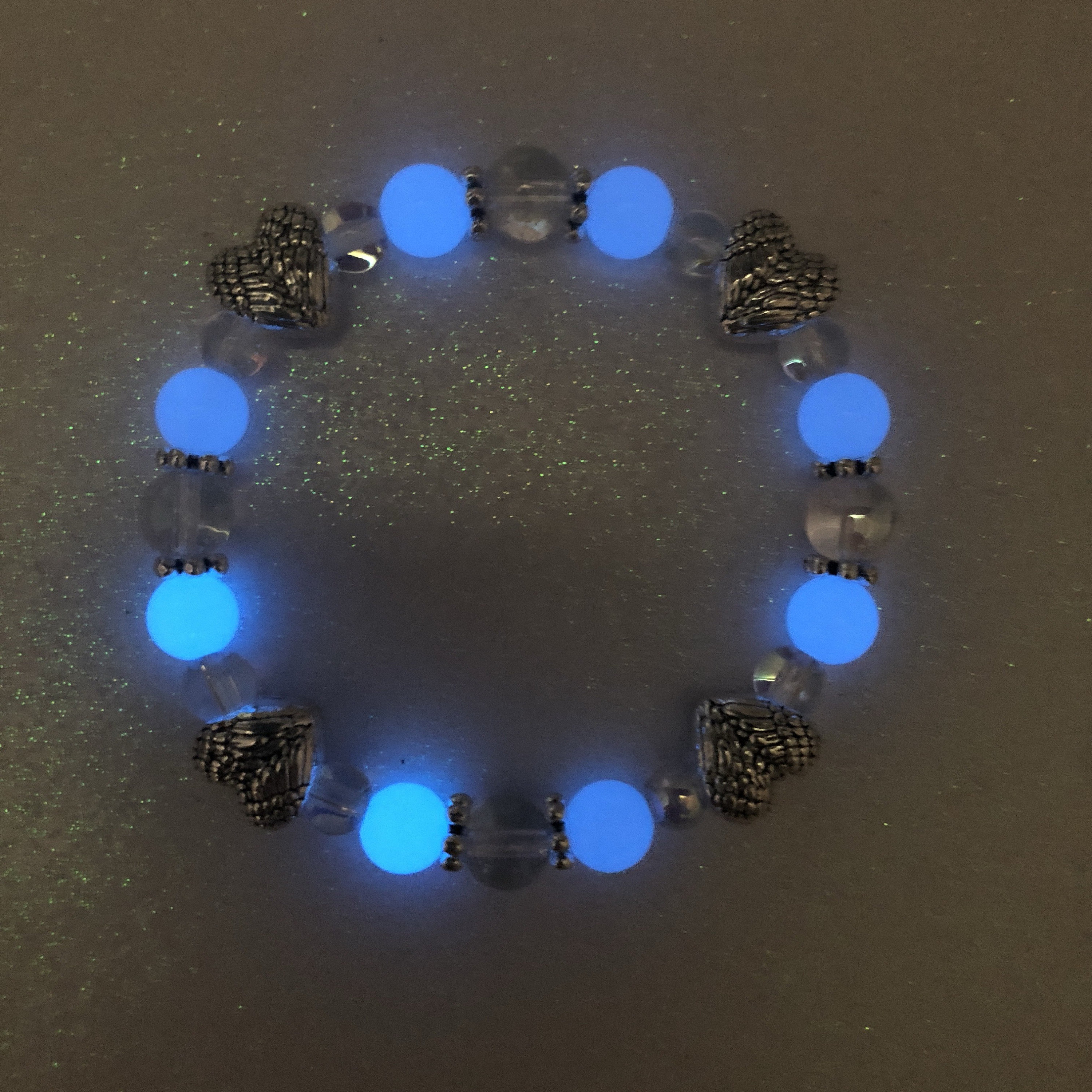 My dear friend lost her beautiful Mother and I designed this bracelet for her. It was made with a heavy heart, but it came out absolutely beautiful. The angel wings are in a shape of a heart, which is so lovely and passionate. I used rainbow coated clear glass beads for a little bit of magic and to represent the beautiful afterlife. We will all meet again in the rainbows. The neutral colored beads glow a beautiful serene blue color in the dark. Just wear in the sun, and the uv lights will charge the glow. All non toxic and will recharge for many years. I use top quality stretch cord and special knots plus glue to make this a comfortable and easy wearing bracelet. When you see the glow on your wrist, it is so magical.<3
