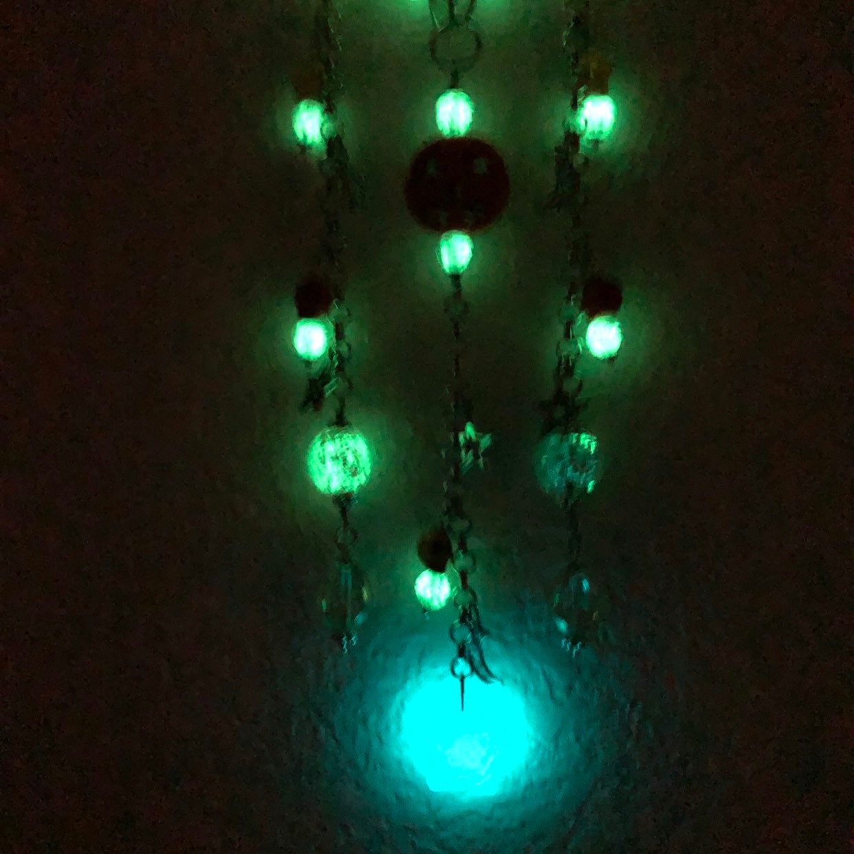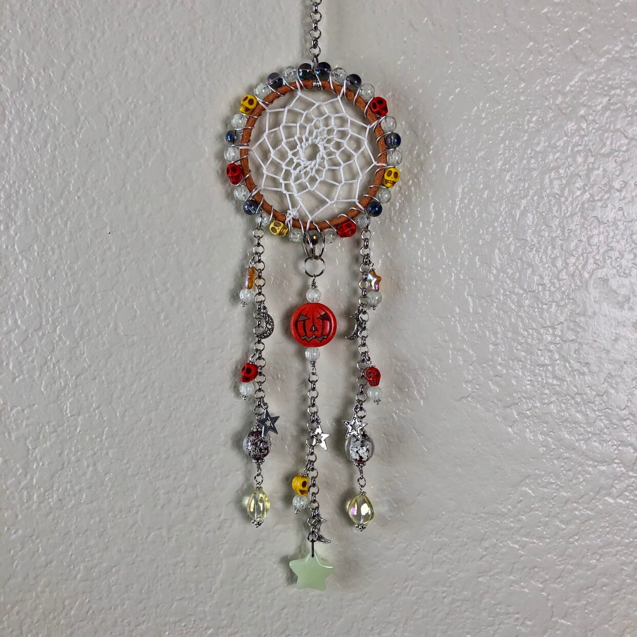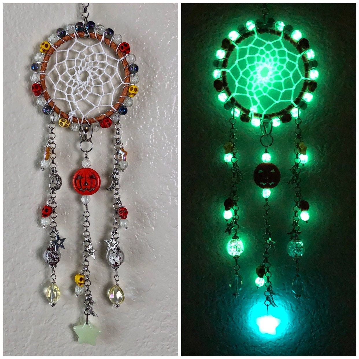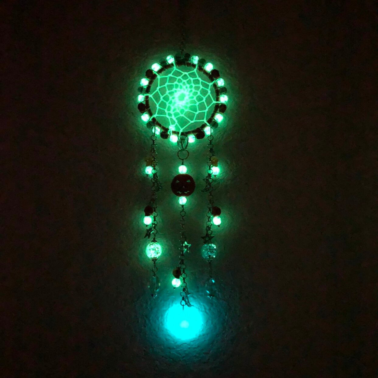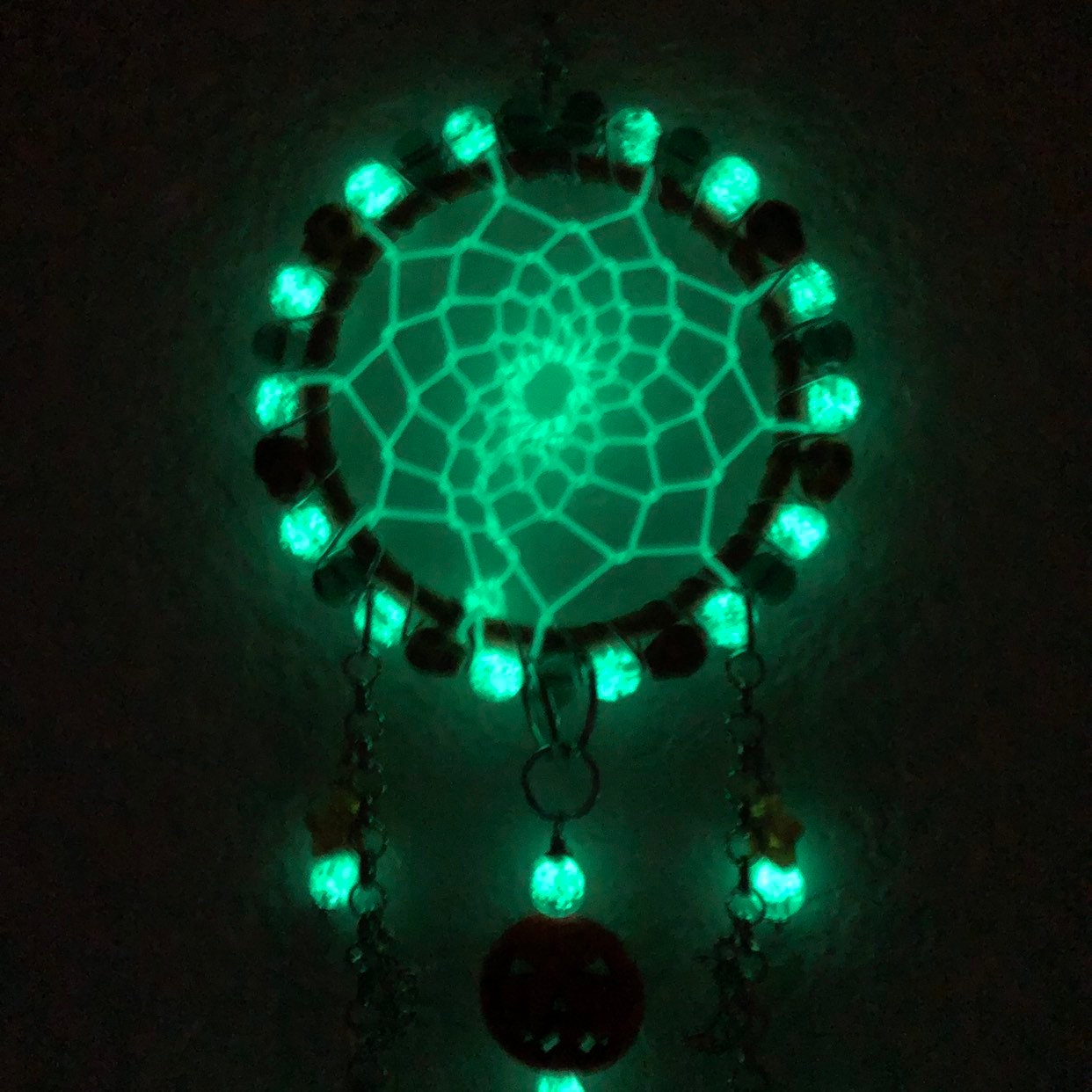 This one is a little size compared to my other dream catchers, it is almost 4 inches wide and 12 inches long. Three long silver chains dangle with more howlite skull beads, artisan glass star beads, two large purple colored glow beads (glows green-blue) and one large glow stone star at the bottom for extra crazy glow power. And of course the large howlite orange jackolantern bead makes it super halloween. Lots of glow for a small dream catcher. :)