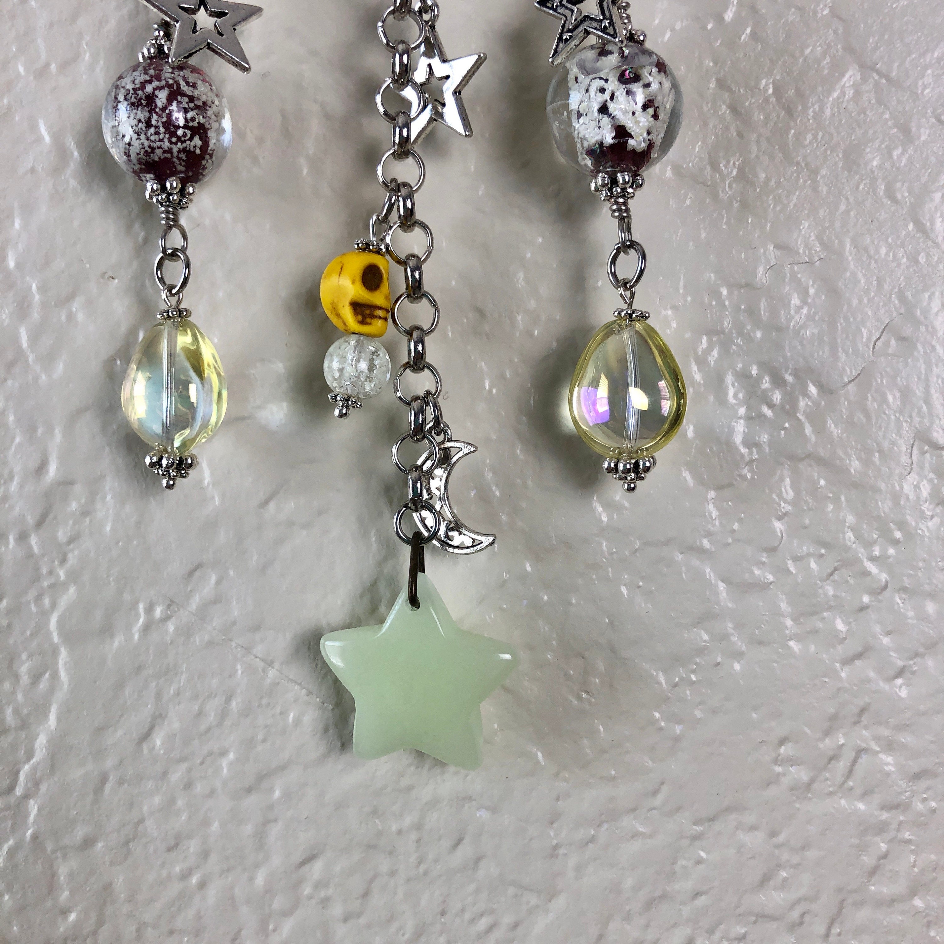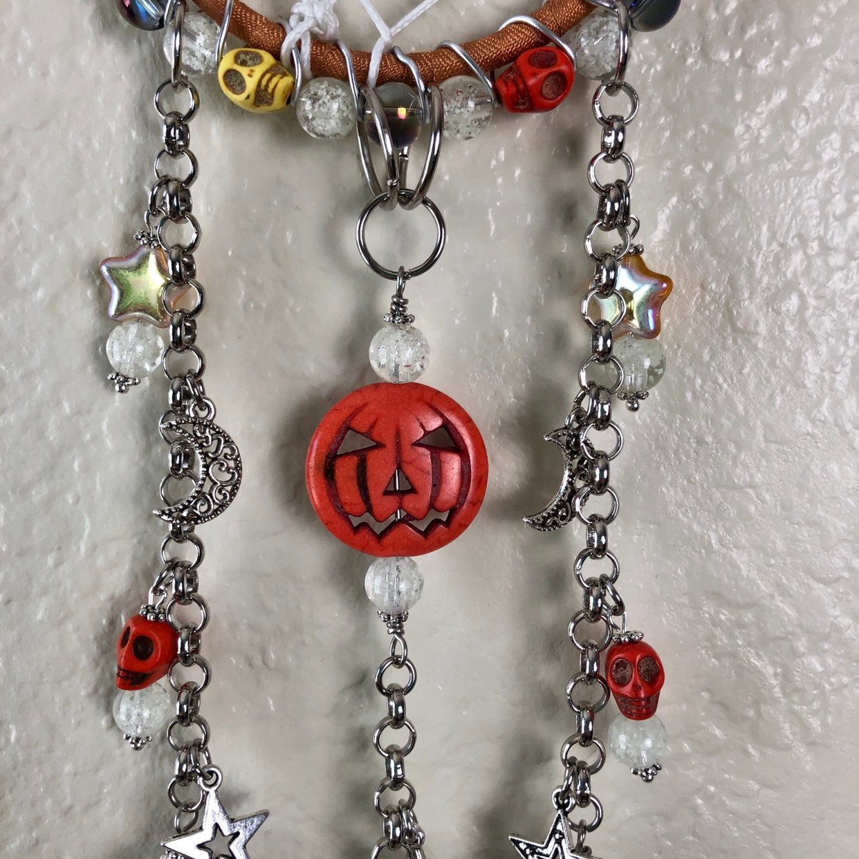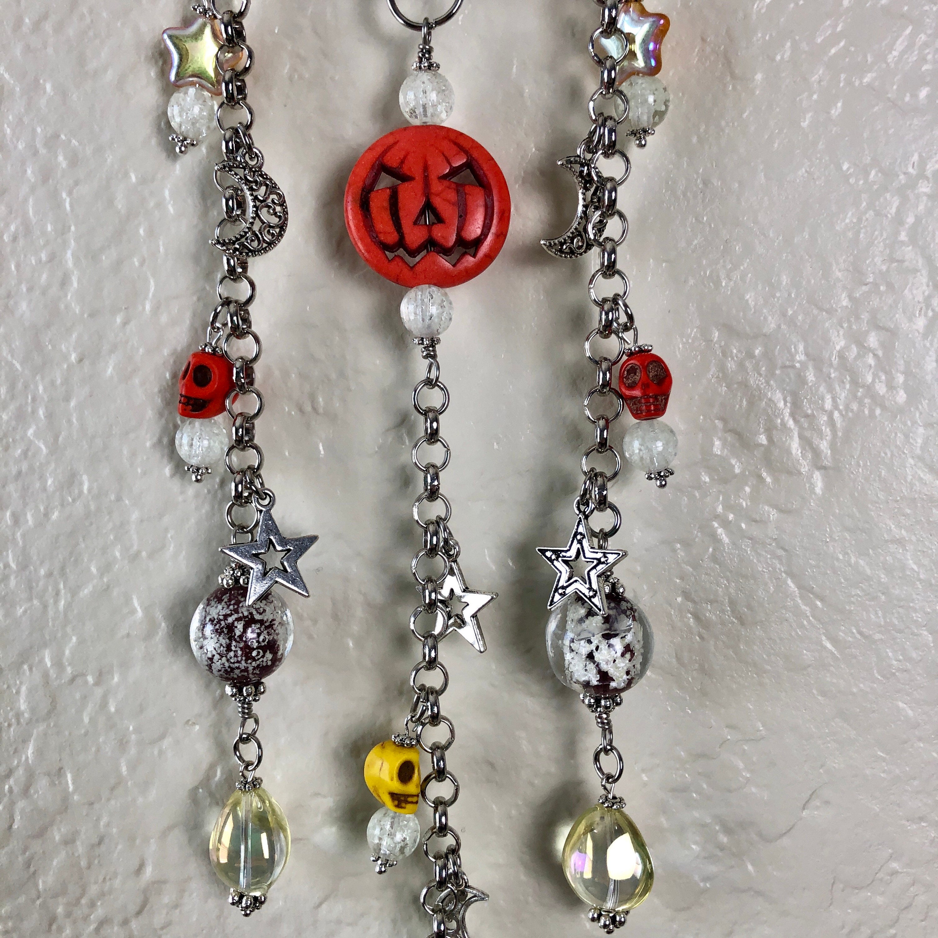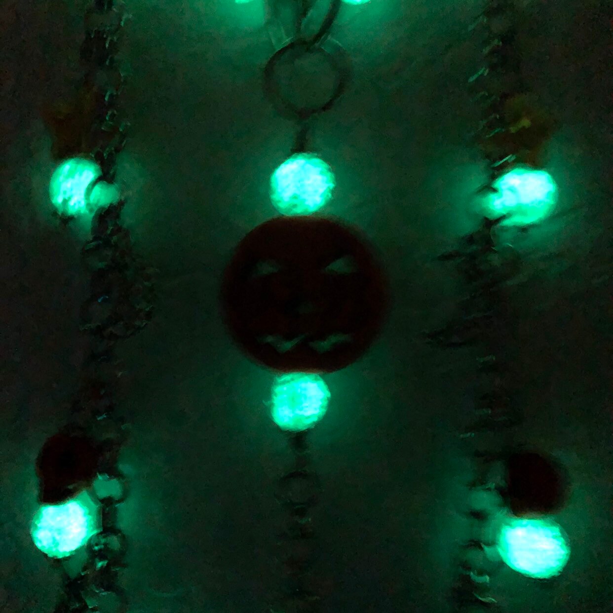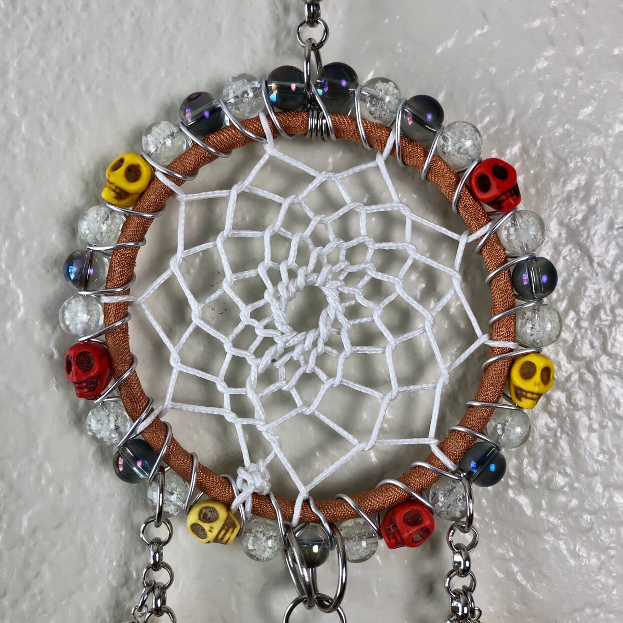 This one is a little size compared to my other dream catchers, it is almost 4 inches wide and 12 inches long. Three long silver chains dangle with more howlite skull beads, artisan glass star beads, two large purple colored glow beads (glows green-blue) and one large glow stone star at the bottom for extra crazy glow power. And of course the large howlite orange jackolantern bead makes it super halloween. Lots of glow for a small dream catcher. :)