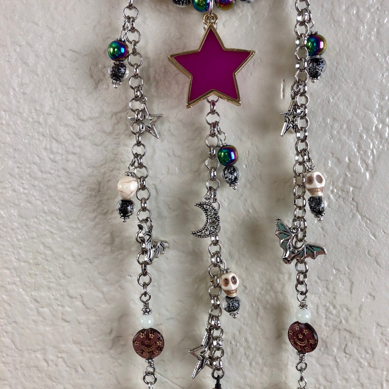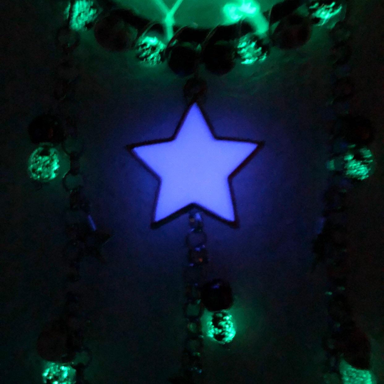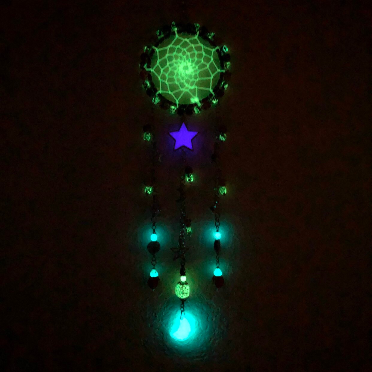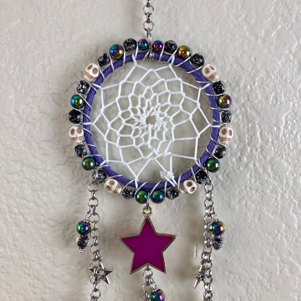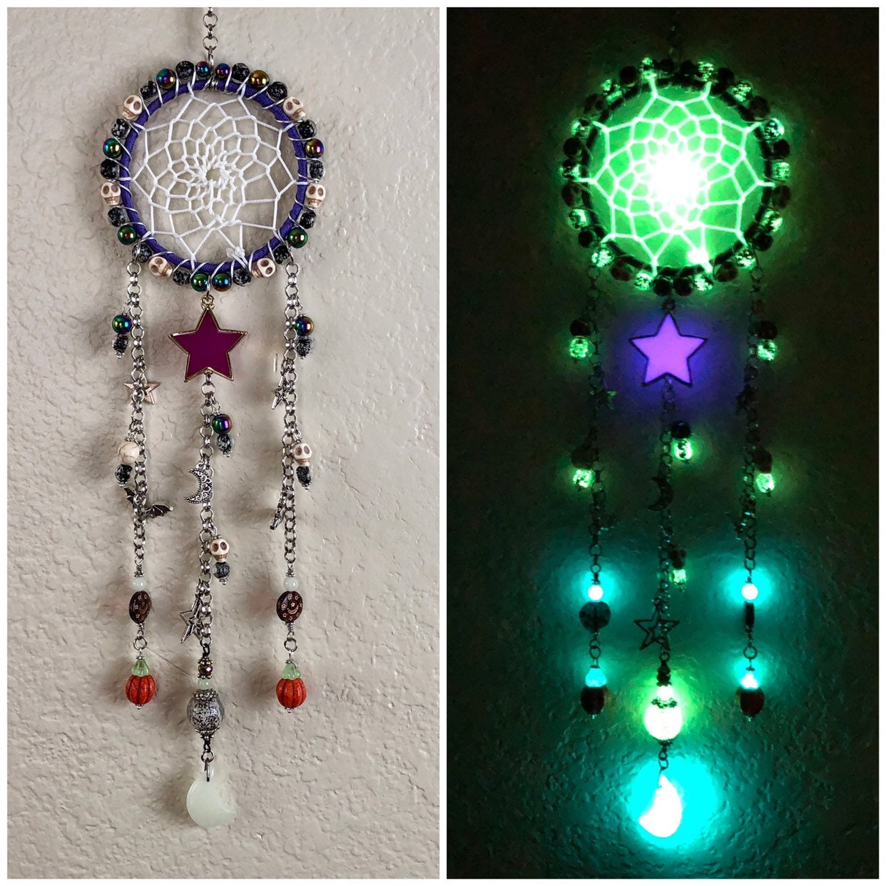 I made this Halloween Dream Catcher because Halloween is my favorite holiday! And it came out so cute. I used a steel ring wrapped with ribbon and wire wrapped with howlite skull beads, rainbow titanium coated hematite beads, orange howlite pumpkins and glass glow beads. I wove the web with glowing cord and it came out great. There is one large purple star that I made that glows violet purple. This color needs uv light and sun is best, the uv light I include will charge it and its large and glows so awesome.