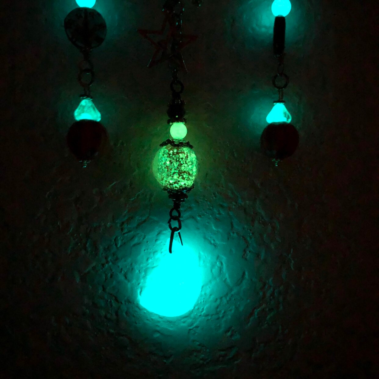 Hang this in a sunny spot and it will absorb uv light and glows in the dark. All non toxic and will recharge for many years. If you have a black light this is awesome decoration for your spooky Halloween parties! I will include uv keychain also which helps to charge it. So cool and I really enjoy making these. I know the new owner will enjoy it. :)